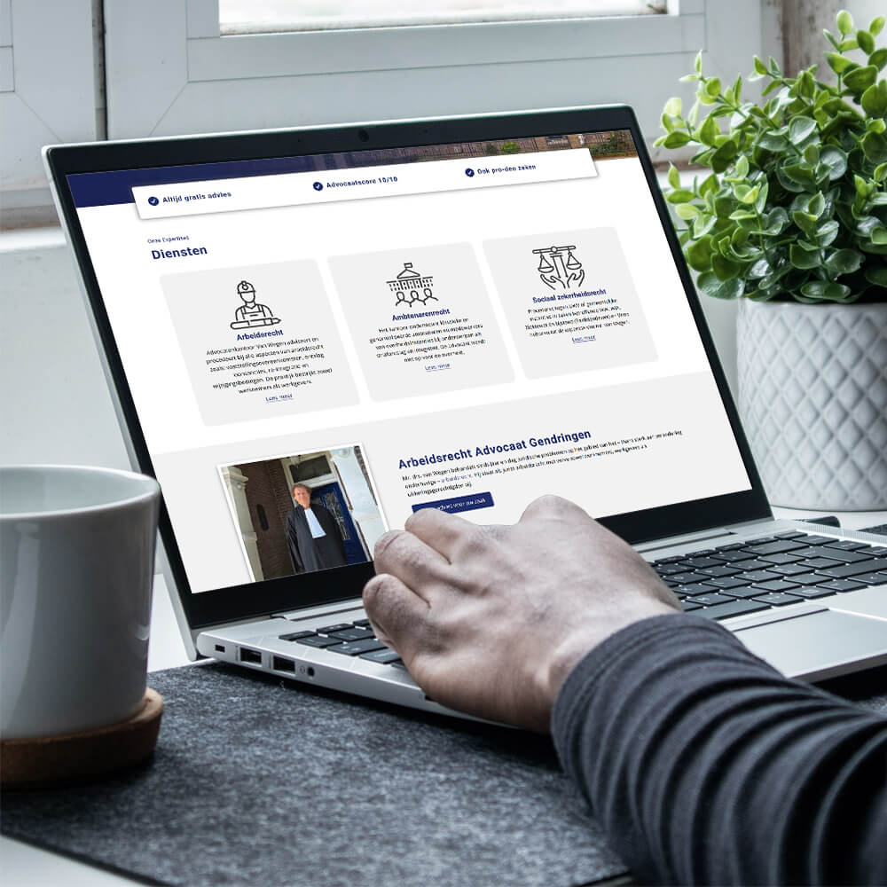 De website is ingericht vanuit het perspectief van de cliënt. Bezoekers vinden snel de juiste informatie over hun situatie en weten waar ze terechtkunnen voor hulp. De navigatie is logisch opgebouwd en sluit aan op herkenbare vragen rondom arbeidsrecht, ambtenarenrecht en sociaal zekerheidsrecht.