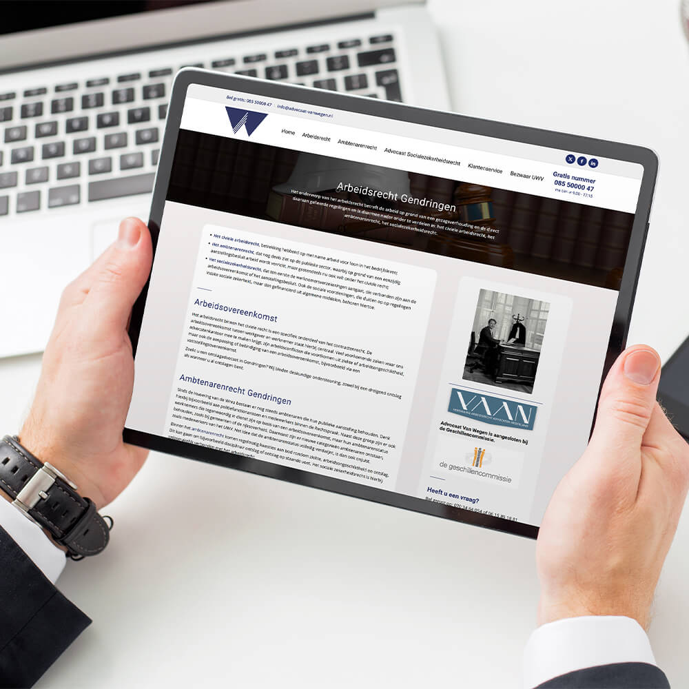 Voor Advocaat Van Wegen is gekozen voor een helder en functioneel websiteontwerp dat past bij een gespecialiseerde arbeidsrechtpraktijk. Geen visuele poespas, maar een duidelijke structuur waarin inhoud leidend is. Het ontwerp ondersteunt het verhaal van het kantoor: deskundig, toegankelijk en gericht op inhoudelijke kwaliteit.